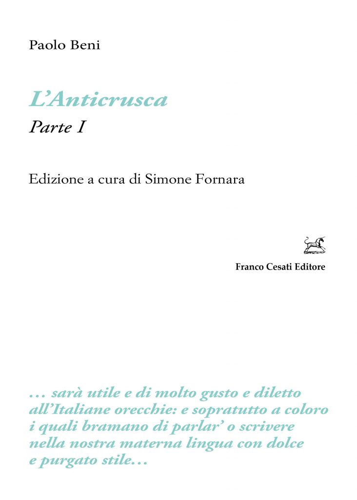 È da oggi disponibile, presso l’editore Franco Cesati, l’edizione moderna della prima parte dell’Anticrusca di Paolo Beni curata da Simone Fornara.
