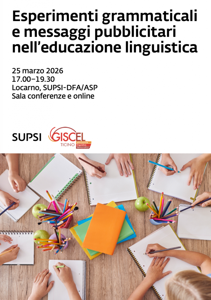 Il 23 marzo 2026, dalle 17 alle 19:30, presso la Sala conferenze SUPSI-DFA/ASP, il Centro competenze didattica dell’italiano lingua di scolarizzazione del Dipartimento formazione e apprendimento / Alta scuola pedagogica, in collaborazione con il gruppo GISCEL Ticino, organizza un evento dedicato all’insegnamento della grammatica e della testualità nella scuola dell’obbligo.