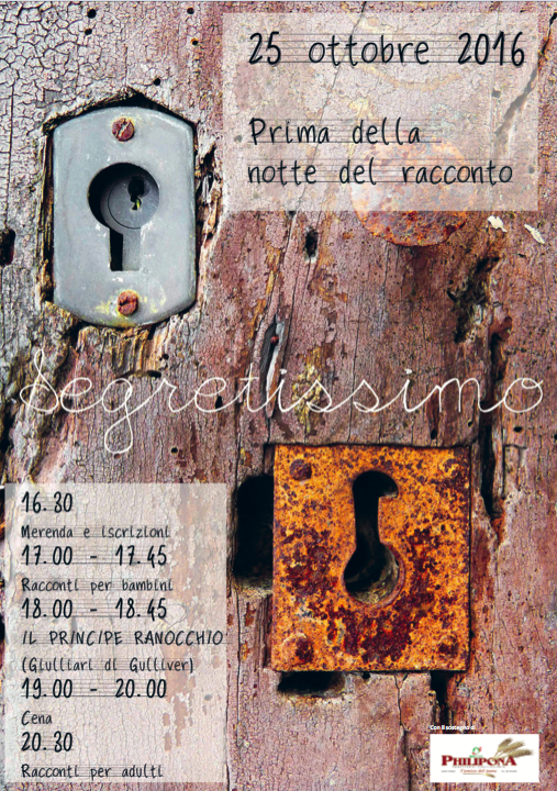 Il tema è lo stesso della Notte del racconto: “Segretissimo”. La data il 25 ottobre 2016. Nel pomeriggio, oltre ad alcune postazioni con racconti per bambini, ci sarà lo spettacolo degli imperdibili Giullari di Gulliver Il principe ranocchio. Cliccando qui troverete ulteriori informazioni.